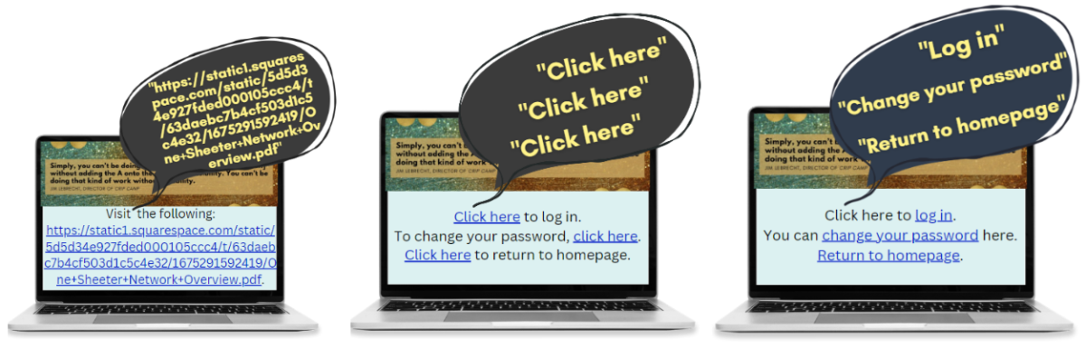 - Make sure that any hyperlinks to websites are linked from the text, and that the text provides a clear descriptor. If you leave a URL visible, screen readers will read out loud every letters and number. The graphic below illustrates what screen readers say.